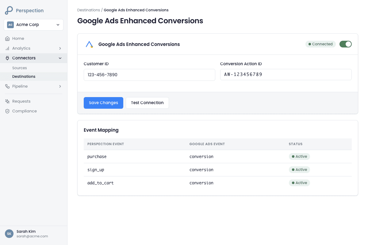 ctId=XXXXXXXXX.Requirement: The Conversion Action must be configured as a "Website" conversion source with "Enhanced conversions" enabled in Google Ads settings. Perspection maps the Conversion Action ID to the full resource path