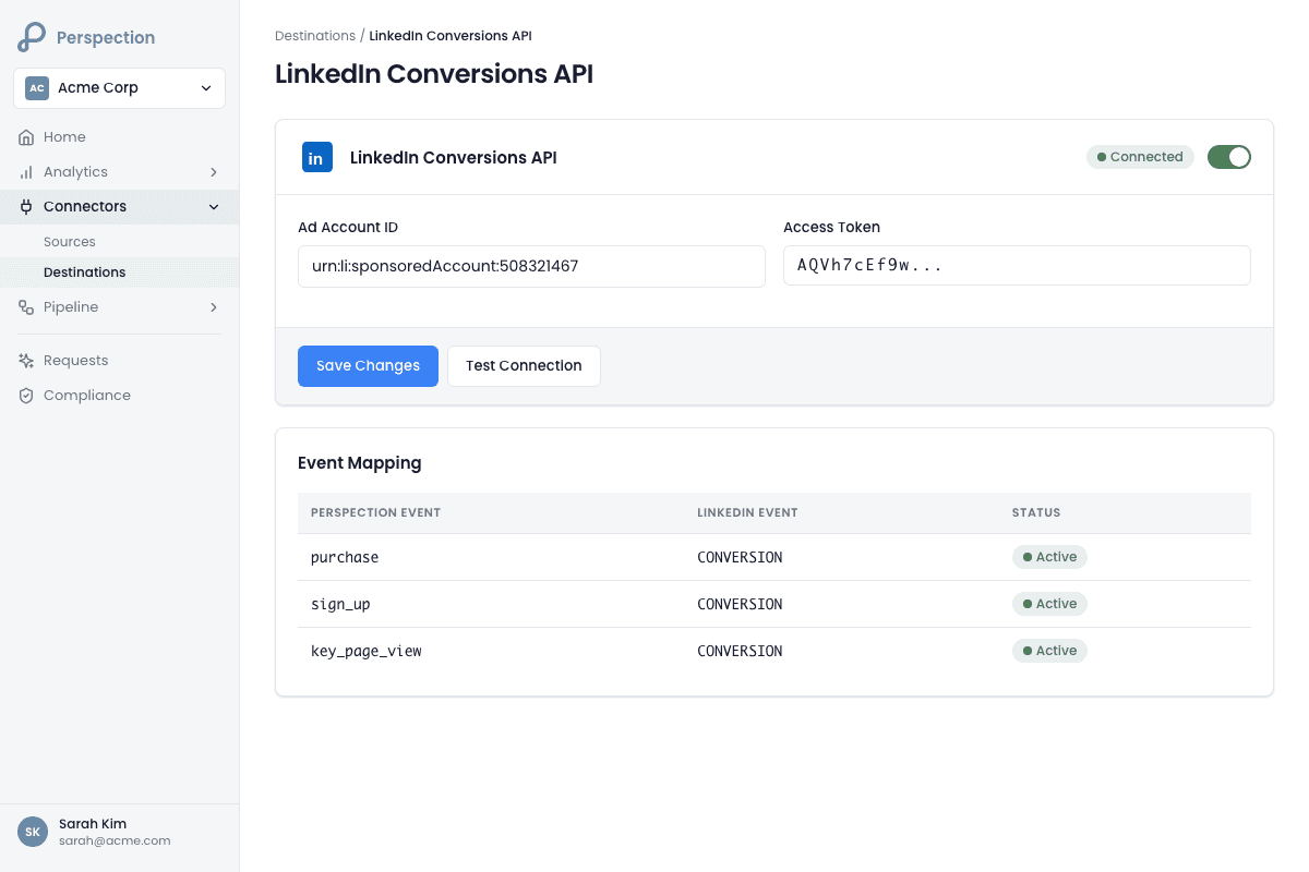 Connecting Perspection to LinkedIn Conversions API requires navigating to Connectors in the Perspection dashboard, selecting the LinkedIn destination card, entering 3 required credential fields (Ad Account ID, Access Token, and Conversion Rule ID), saving the configuration, and running the built-in connection test to confirm API access to the LinkedIn Marketing API version 202402.
