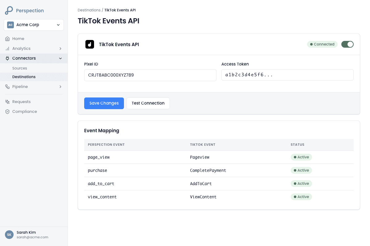 Perspection connects to the TikTok Events API v1.3 through a server-side integration that bypasses browser ad blockers and cookie restrictions. The setup requires 2 credentials -- a Pixel ID and an Access Token -- both obtained from TikTok Ads Manager. Perspection automatically normalizes and SHA-256 hashes all personally identifiable information (email, phone) before dispatching events to TikTok servers. The TikTok connector supports 1,000 requests per minute per access token, maps 20+ event types to TikTok standard events, calculates a real-time Event Match Quality score for every dispatch, and enforces GDPR/CCPA compliance through the Limited Data Use flag. An optional Baseline Pixel Code field enables side-by-side comparison of server-side conversion recovery against existing browser pixel tracking.