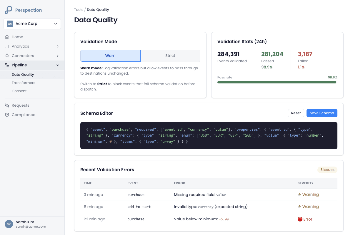 Perspection data quality contracts are JSON Schema definitions that validate incoming event payloads at Stage 1.5 of the processing pipeline -- after ingestion but before deduplication, identity resolution, and destination dispatch. Each data quality contract targets a specific event type (such as purchase or page_view) or a wildcard (*) for all event types. Perspection enforces contracts in one of three validation modes: Off (no validation), Warn (log violations but pass events through), or Strict (block non-conforming events entirely). The Perspection dashboard provides a three-tab Data Quality interface under Pipeline > Data Quality -- Schemas for contract management, Violations for paginated inspection of failures, and Coverage for aggregate metrics on schema adoption and enforcement posture. Data quality contracts use the AJV (Another JSON Validator) library with a bounded in-memory cache of up to 200 compiled schemas per processing worker, ensuring sub-5ms validation overhead per event.