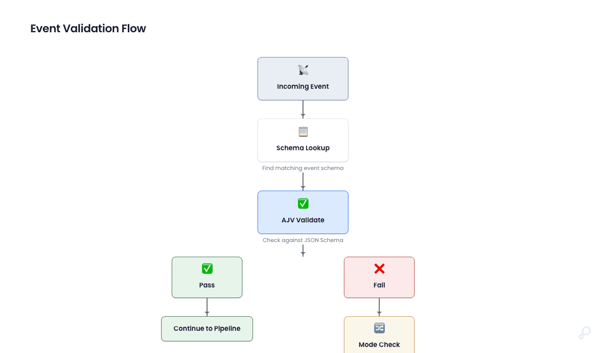 Stage 1.5: Schema Contract Validation -- The processing worker validates the event properties against the matching JSON Schema contract.