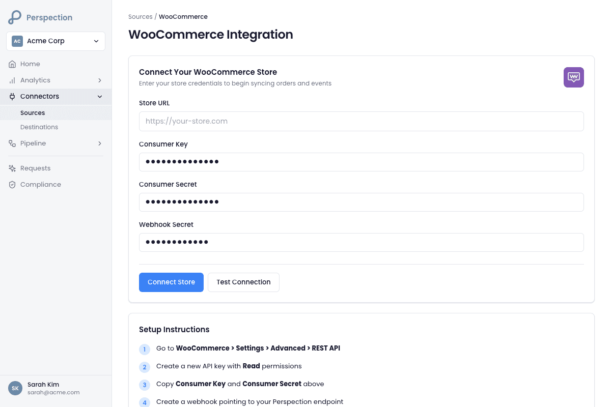 Open the Perspection dashboard and navigate to Connectors > Sources > WooCommerce.